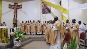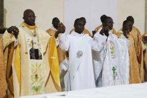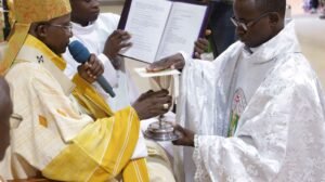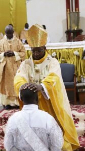Nous pouvons rendre grâce au Seigneur pour le don de sacerdoce qui confère à chacun de ceux que le Seigneur choisit, « un pouvoir sacré de former et conduire le peuple sacerdotal, pour accomplir, dans le rôle du Christ, le sacrifice eucharistique et l’offrir à Dieu au nom du peuple tout entier ». Une tâche noble et difficile à laquelle le Seigneur convie en ce jour, notre frère et ami l’Abbé Michel WOBA OLIGA. Il a reçu, la grâce sacerdotale par l’imposition des mains de son excellence Mgr Laurent Lompo qui a fait de lui, un prêtre de Jésus Christ pour l’éternité.